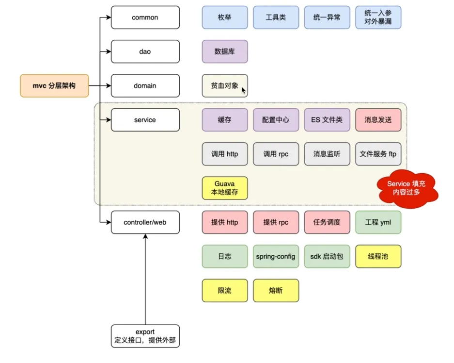 - 但不要只是把充血模型,仅限于一个类的设计和一个类内的方法设计。充血还可以是整个包结构,一个包下包括了用于实现此包 Service 服务所需的各类零部件(模型、仓储、工厂),也可以被看做充血模型。